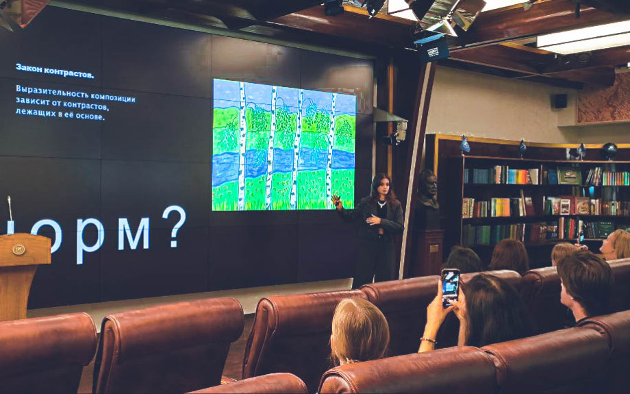 Затем внимание переключилось на искусство. Художник и автор канала об искусстве "Смысл быть иллюстратором" Ксения Рожкова показала, как знания о географии помогают создавать выразительные и достоверные работы. Гости разбирали, что превращает этюд в выразительный пейзаж, учились улавливать характер местности — суровость тайги, нежность подмосковного луга или прозрачность северного воздуха.